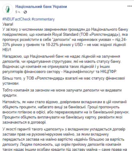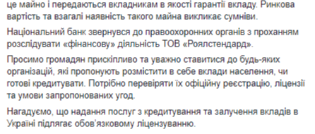 Национальный банк обращает внимание на то, что регулятор не предоставляет лицензий на привлечение депозитов или кредитование структурам, которые не имеют статуса банка. Компания Royal Standard, подчеркивают в НБУ, не имеет статуса финансового учреждения, поэтому привлекать депозиты и выдавать кредиты она не имеет права.