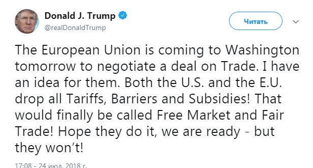 "Представители ЕС завтра прибудут в США, чтобы обсудить торговое соглашение. У меня есть идея. И Вашингтон, и Брюссель отказываются от пошлин, торговых барьеров и субсидий. Это наконец можно будет назвать "свободным рынком" и "честной торговлей". Надеюсь, что они согласятся, мы готовы — но они нет", — заявил он.