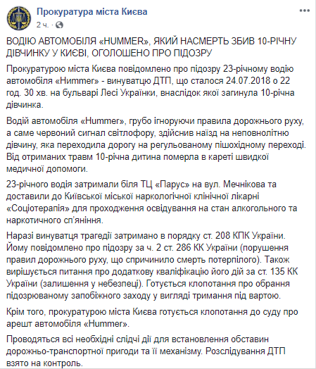 Прокуратура будет просить суд оставить водителя под стражей без права внесения залога. Заседание по мере пресечения назначено на 26 июля, оно пройдет в Шевченковском райсуде Киева.
