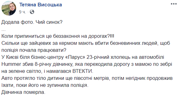 Когда прекратится этот беспредел на дорогах? Сколько еще зайцевых за рулем должны убить невинных людей, чтобы полиция начала работать?" - интересуется журналистка Татьяна Высоцкая.