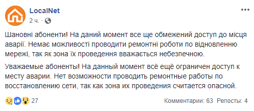По данным провайдера в данный момент всё ещё ограничен доступ к месту аварии. "Нет возможности проводить ремонтные работы по восстановлению сети, так как зона их проведения считается опасной. Мы, также как и коммунальные службы, не предполагали таких разрушительных последствий. Все ресурсы компании задействованы на устранение проблемы. Ещё раз приносим свои извинения за временные неудобства," - заявили в компании.