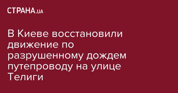 В Киеве восстановлено движение транспорта по улице Елены Телиги, где на перекрестке с улицей Кирилловской произошло разрушение дорожного покрытия вблизи путепровода. Об этом во время брифинга в четверг, 26 июля, сообщил глава КП Киевавтодор Александр Густелев, сообщает УНН.