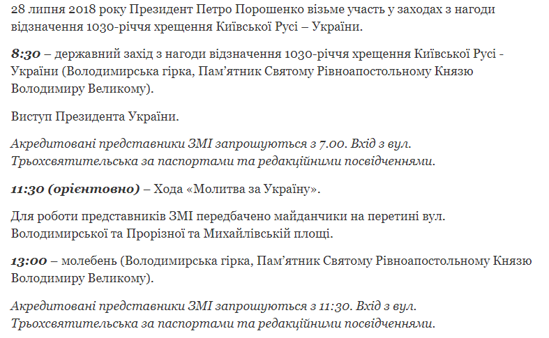 28 июля 2018 Президент Петр Порошенко примет участие в мероприятиях по случаю 1030-летия крещения Киевской Руси - Украины. Об этом сообщает пресс-служба главы государства.