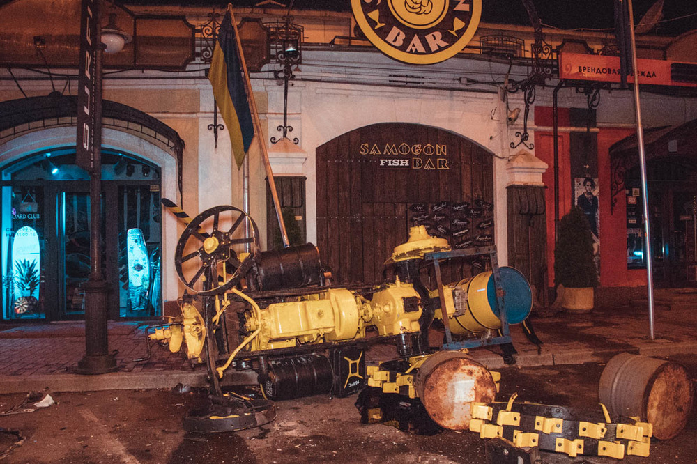 Авария случилась в 02:48. По предварительной информации, BMW на грузинских номерах двигался на высокой скорости по Гаванскому мосту в сторону правого берега. Водитель не справился с управлением и на съезде с моста вылетел с проезжей части. В результате происшествия машина получила серьезные повреждения, а раритетный трактор, который стоял в качестве рекламы Samogon Bar, оказался перевернутым на бок.