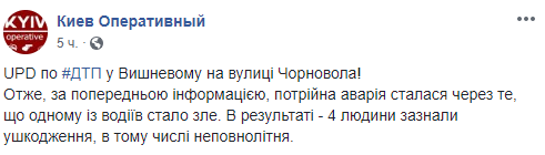 На месте работает следственно-оперативная группа Киево-Святошинского отдела полиции. Допрашиваются участники ДТП, свидетели, устанавливаются все обстоятельства и причины аварии.