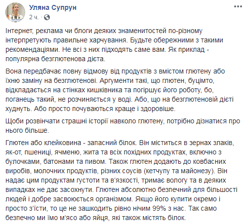 Исполняющая обязанности министра здравоохранения Украины Ульяна Супрун вновь предостерегла читателей своего Facebook. На этот раз – от популярной безглютеновой диеты.