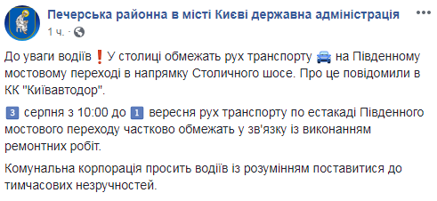 Об этом со ссылкой на КК "Киевавтодор" в четверг, 2 августа сообщает Печерская районная в городе Киеве государственная администрация на странице.