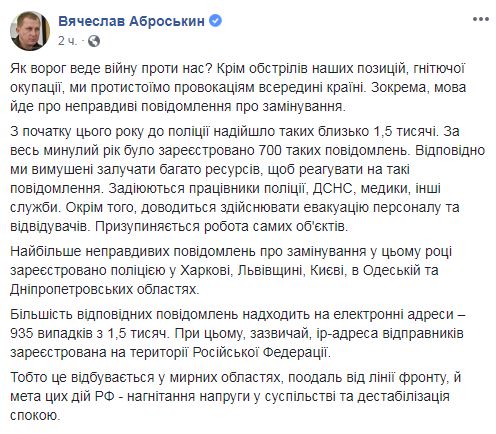 В Нацполицию с начала 2018 года поступило 1500 ложных сообщений о заминировании, в то время как за весь 2017 год таких сообщений было всего 700, сообщил первый замглавы Национальной полиции Вячеслав Аброськин в Facebook.