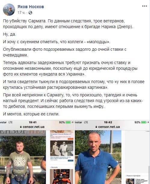 "По данным следствия, трое ветеранов, проходящих по делу, имеют отношение к бригаде Нарика (Днепр)". ВО-вторых, по поводу слитых в сеть фото до официального задержания. Могут быть вопросы, если адвокаты предъявят, что задержанных опознали сугубо из-за того, что обществу заранее сообщили о факте поимки нескольких мужчин", - написал он.