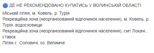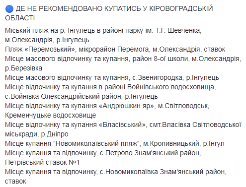 Не рекомендуется купаться на "Новониколаевском пляже" в Кропивницком, а также в Александрии и Светловодске Кировоградской области, в Северодонецке и Старобельске Луганской области, в г.Коростень Житомирской области, "Молодежном" пляже в Золочеве Львовской области, в Ривном и городах Здолбунов, Дубровица, Радивилов и Дубно Ривненской области.