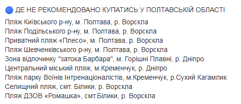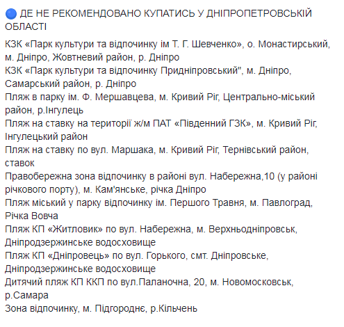 Не рекомендуется купаться на пляжах Винницы, Ковеля Волынской области, Староконстантинова Хмельницкой области, Черкасс, Днепра, Кривого Рога, Каменского возле речпорта, Павлограда и Верхнеднепровска Днепропетровской области, Запорожья, Энергодара, в Николаеве, Полтаве, Кременчуге и Горишних Плавнях.