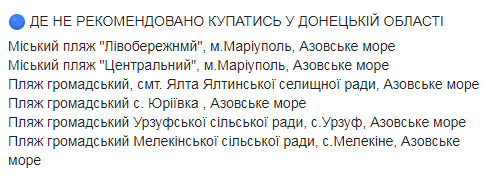 Из морских пляжей в список попали "Центральный" и "Левобережный" пляжи в Мариуполе, а также в близлежащих пгт Ялта и селах Юрьевка, Урзуф, Мелекино.