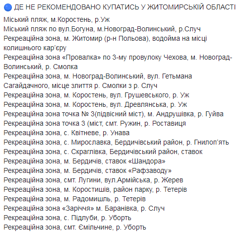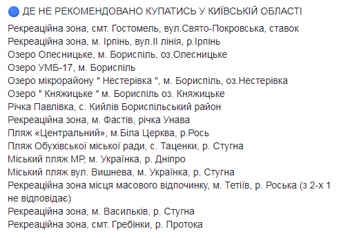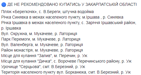 В список нерекомендованных попали пляжи в рекреационных зонах ряда городов Винницкой и Житомирской областей, Чернигова на Десне, а также некоторые пляжи рек Уж, Латорица, Синявка и Иршавка в Закарпатье.