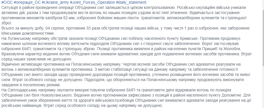 "Противник 33 раза открывал огонь по позициям наших войск, в том числе 1 раз из тяжелого вооружения", - говорится в сводке, опубликованной на странице пресс-центра штаба в соцсети Фейсбук в воскресенье.