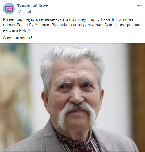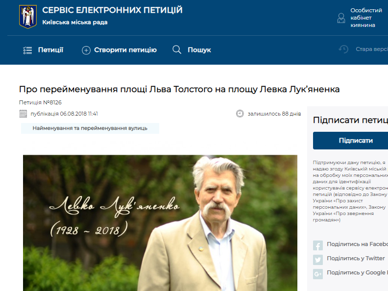 На сайте КГГА зарегистрировали петицию о переименовании площади Льва Толстого в честь Левка Лукьяненко, который умер в этом году. Петиция №8126 была зарегистрирована на сайте вчера, 6 августа. В пояснительном тексте отмечается, что автор петиции - Киевское братство Архистратига Божьего Михаила УАПЦ.