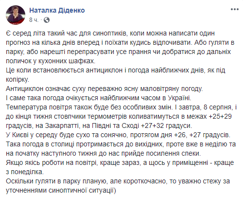 "Есть среди лета такое время для синоптиков, когда можно написать один прогноз на несколько дней вперед и поехать куда-то отдыхать. Или гулять в парке, или наконец выгладить все стирки или добраться до дальних полок в кухонных шкафчиках. Это когда устанавливается антициклон и погода ближайших дней, как под копирку. Антициклон означает сухую, преимущественно ясную маловетреная погоду. И именно такая погода ожидается в ближайшее время в Украине", - написала синоптик.