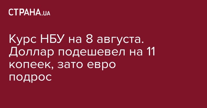 Национальный банк Украины установил официальный курс основных валют по отношению к гривне на среду, 8 августа. Об этом сообщается на сайте регулятора.