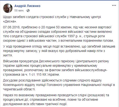 На месте гибели срочника в учебном центре "Десна" под Черниговом нашли предсмертную записку, в которой говорится о добровольном намерении уйти из жизни. Об этом сообщил пресс-секретарь Генпрокуратуры Андрей Лысенко на своей странице в Facebook.
