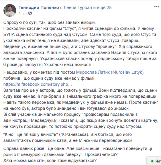 Актер Геннадий Попенко в Facebook написал, что из фильма "Стус" вырезали сцену суда с адвокатом Медведчуком.