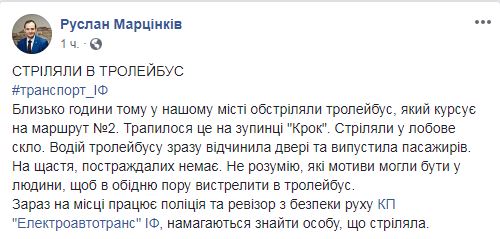 "Около часа назад в нашем городе обстреляли троллейбус, который курсирует на маршруте №2. Случилось это на остановке "Крок". Стреляли в лобовое стекло", - говорится в сообщении.