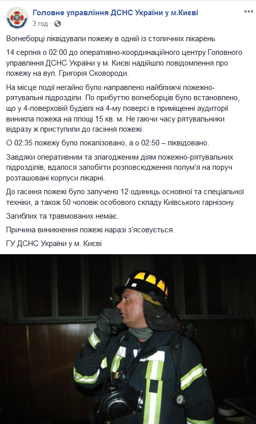 Сегодня ночью, 14 августа, в Киеве вспыхнул пожар в одной из больниц. Об этом сообщает пресс-служба ГСЧС в своем Facebook.