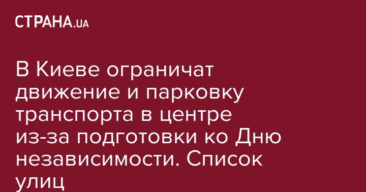 В Киеве ограничат или запретят движение транспорта на ряде улиц из-за подготовки к Дню независимости Украины, сообщается на сайте Киевской городской администрации.
