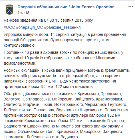 Обстрелы осуществлялись по защитникам Крымского, Троицкого, Золотого, Светлодарска, Майорска, Зайцево, Красногоровки, Опытного, Марьинки, Песков, Новотроицкого, Чермалыка, Гнутово, Лебединского, Павлополя, Водяного и Широкино.