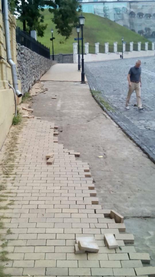 Ливень, судя по всему, просто смыл асфальтную плитку в некоторых местах.