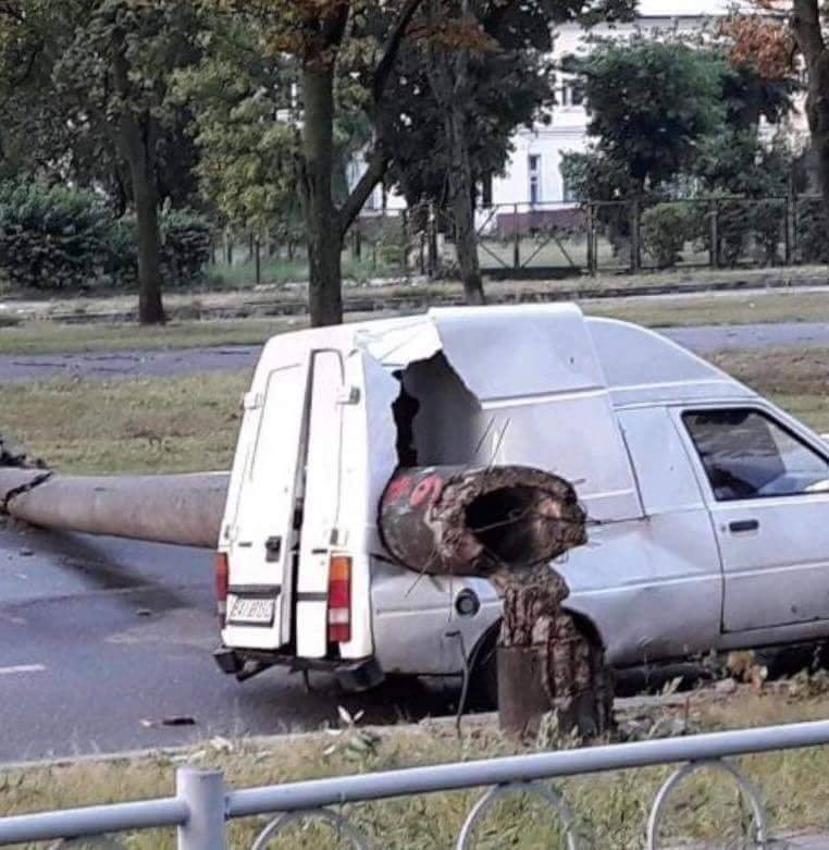 Появилось видео автомобиля, который насквозь прошил поваленный столб. К счастью, людей в этот момент рядом не было.