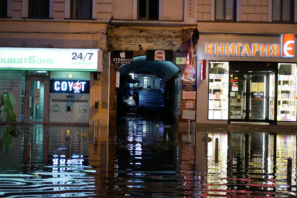 Утром машинам и пешеходам на Подоле пришлось пробираться по потокам грязи, которую принесла дождевая вода.