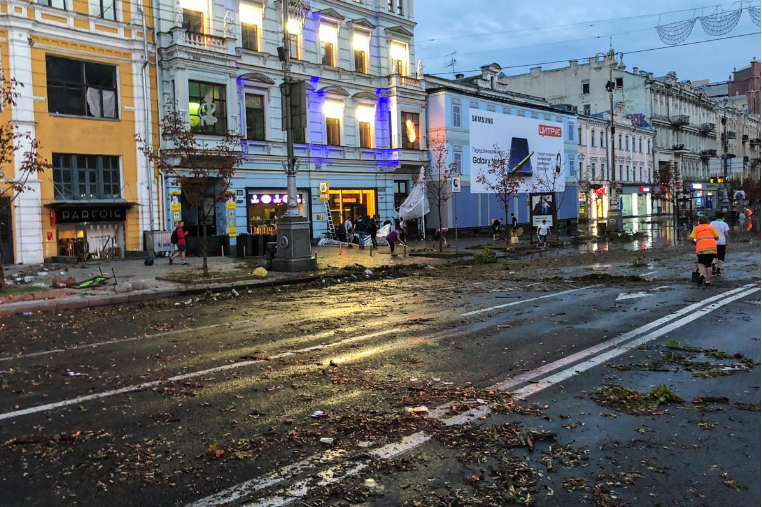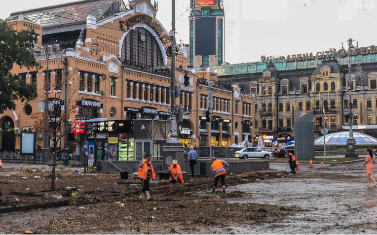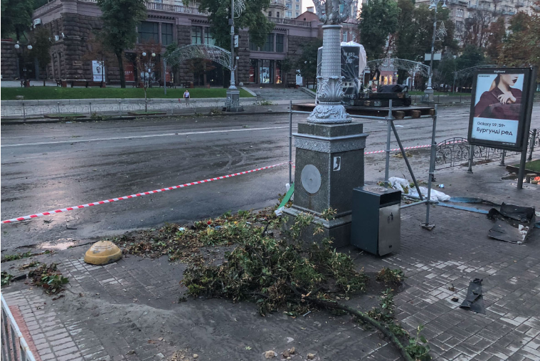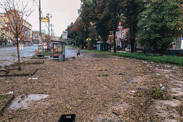 Оказались разбитыми рекламные щиты и вывески. были повалены деревья. Ночью вода затопила всю проезжую часть. Утром, после того, как потоки схлынули, оказалось, что Крещатик завален горой мусора и грязи. Сломанные ветки и мусор коммунальщики вручную достают из ливневок и устраняют последствия ночной грозы.