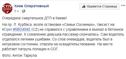 В Святошинском районе Киева таксист врезался в ограждение, девушка-пассажирка погибла. Об этом сообщает Киев Оперативный в Facebook.