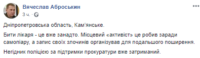 "Днепропетровская область, Каменское. Бить врача - это уже слишком. Местный "активист" это делал ради самопиара, а запись своих преступлений организовал для дальнейшего распространения. Негодяй, при поддержке прокуратуры, уже задержан полицией", - написал в соцсети Аброськин.