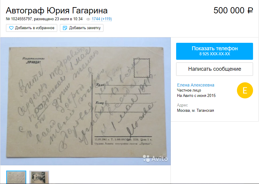 Открытка с автографом Юрия Гагарина продается за 500 тысяч рублей (205 тысяч гривень). Поздравление, адресованное другу космонавта, было написано в 1961 году, через две недели после исторического полета в космос.