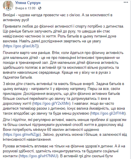 Любовь к спорту и потребность в физической активности формируется с самого детства. Об этом на своей странице в Facebook сообщила глава Минздрава Ульяна Супрун.