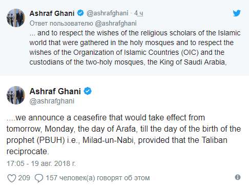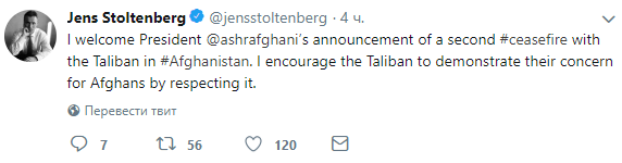 "Я приветствую заявление президента Афганистана о втором перемирии с "Талибаном" в Афганистане, я призываю талибов продемонстрировать неравнодушие по отношению к афганцам, уважая его (решение президента - Прим.Ред.)", - написал Столтенберг в Twitter.