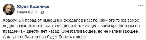 Волонтер Юрий Касьянов пишет: "Красочный парад от нынешних феодалов населению - это то же самое ведро водки, которое выставляли власть имущие своим крепостным по праздникам двести лет назад. Обезболивающее, но не излечивающее. А наутро обязательно будет болеть голова".