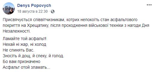 Журналист Денис Попович решил потролить тех, кто жалуется на сломанный асфальт. Он переиначил известное стихотворение Ивана Франко в связи с грядущим парадом: "Посвящается соотечественникам, которых беспокоит состояние асфальтового покрытия на Крещатике, после прохождения военной техники по случаю Дня Независимости.