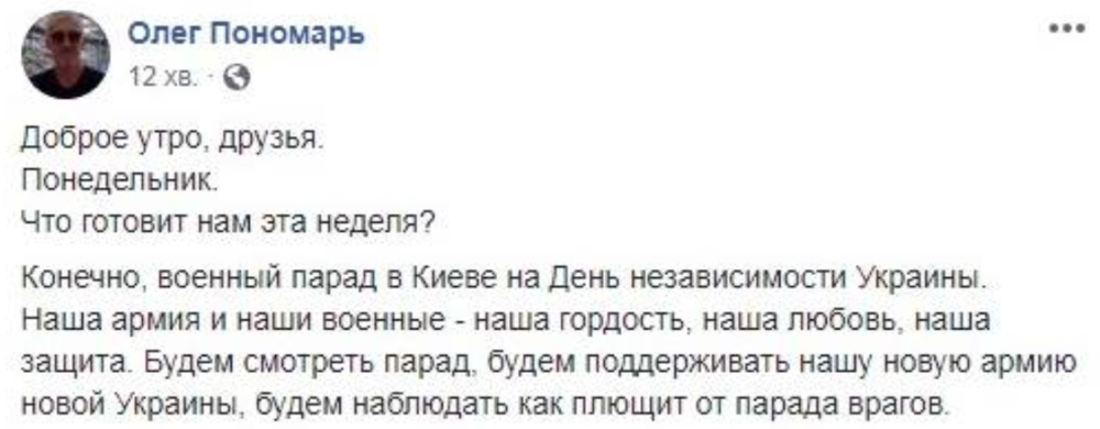 Блогер Олег Пономарь пишет:  "Наша армия и наши военные - наша гордость, наша любовь, наша защита. Будем смотреть парад, будем поддерживать нашу новую армию новой Украины, будем наблюдать как плющит от парада врагов".