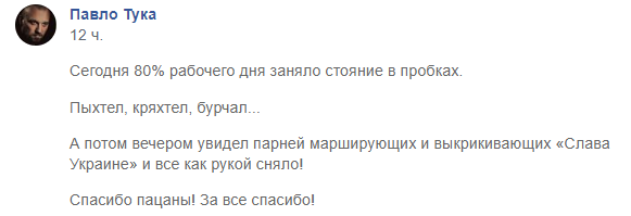 А потом вечером увидел парней марширующих и выкрикивающих "Слава Украине" и все как рукой сняло! Спасибо пацаны! За все спасибо!".
