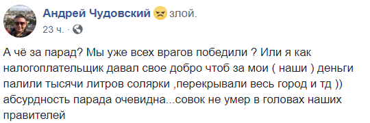 "А чё за парад? Мы уже всех врагов победили ? Или я как налогоплательщик давал свое добро чтоб за мои ( наши ) деньги палили тысячи литров солярки ,перекрывали весь город и тд. Абсурдность парада очевидна...совок не умер в головах наших правителей", - пишет киевский предприниматель Андрей Чудовский.