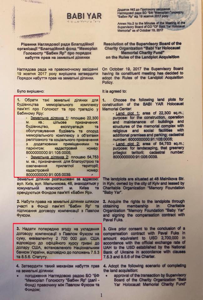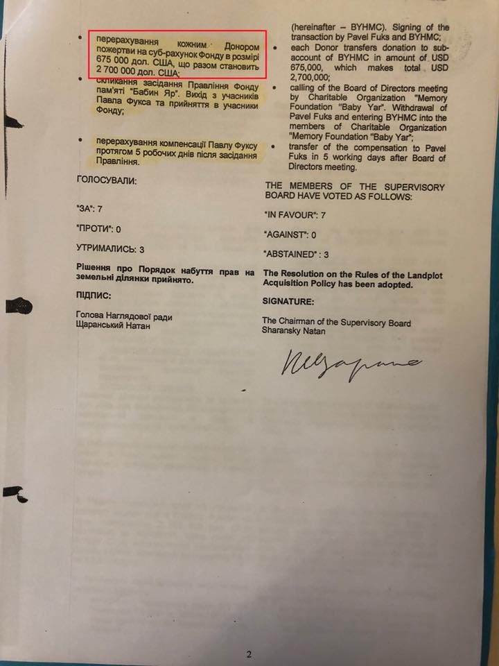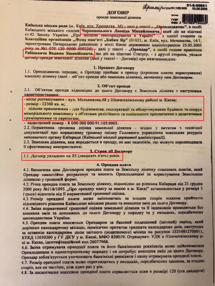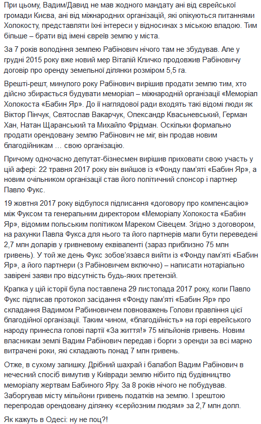 Я публикую документы, свидетельствующие, что Вадим Рабинович за перепродажу земли в Бабьем Яру получил через Павла Фукса 2 700 000 долларов (75 млн гривен). Это тот самый пресловутый застройщик Москвы, бывший харьковчанин, который сейчас финансирует политическую карьеру Рабиновича.