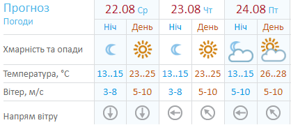 Сайт Weather.com сообщает о трех солнечных днях с 24 по 26 августа включительно. На День независимости днем до +24, на выходных - до +29...+30.