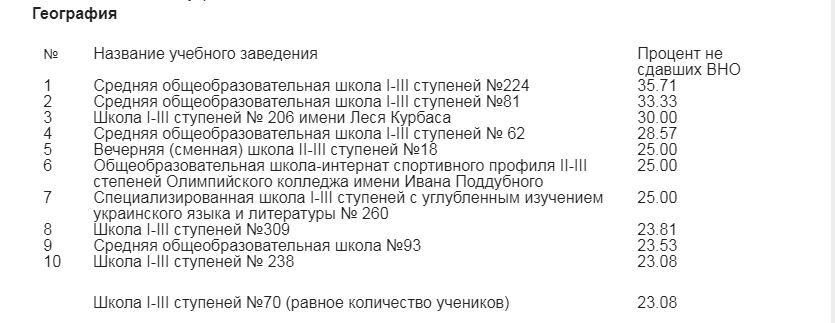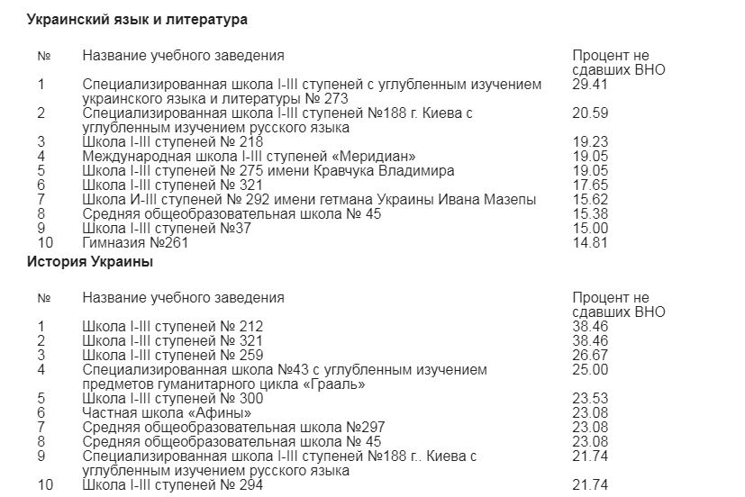 При составлении рейтинга учитывался не только процент участников, не сдавших ВНО, но и количество школьников, сдававших тесты в каждой школе. При равном проценте не сдавших, выше по списку оказалась школа, в которой указанный тест сдавали больше учеников. В антирейтинг включены только школы, в то время как ПТУ, техникумы, колледжи в расчет не брались.