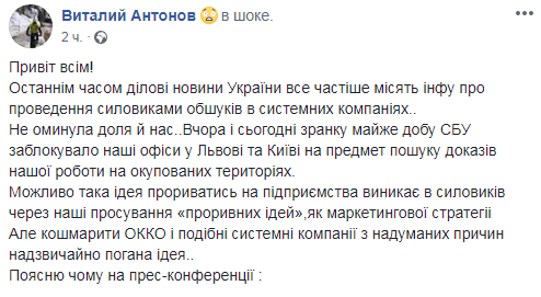 "Вчера и сегодня утром почти сутки СБУ блокирует наши офисы во Львове и Киеве на предмет поиска доказательств нашей работы на оккупированных территориях. Возможно, такая идея прорываться на предприятия возникает у силовиков из-за продвижения наших "прорывных идей", как маркетинговой стратегии. Но кошмарить ОККО и подобные системные компании по надуманным причинам чрезвычайно плохая идея", - отметил он.