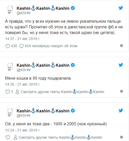Кашин проверил собственные пальцы и нашел сразу два шрама, о чем и написал в твиттер. В ответ пользователи микроблога начали присылать фотографии своих шрамов на указательных пальцах.
