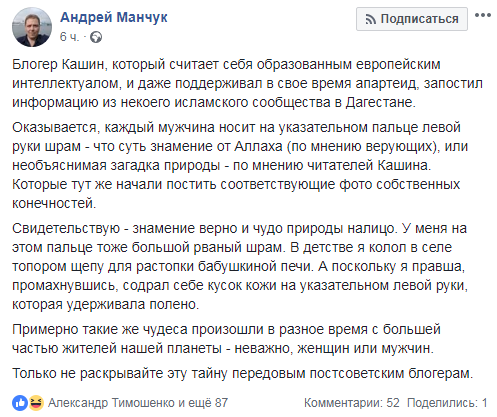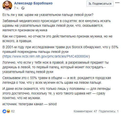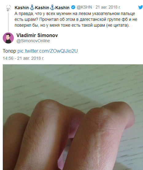 В соцсетях начали активно обсуждать "теорию", что у всех мужчин на указательном пальце есть шрам. Первым об этом в твиттере написал российский журналист Олег Кашин. Сам он узнал о "теории" в "одной из дагестанских групп в фейсбуке", передает Медуза.