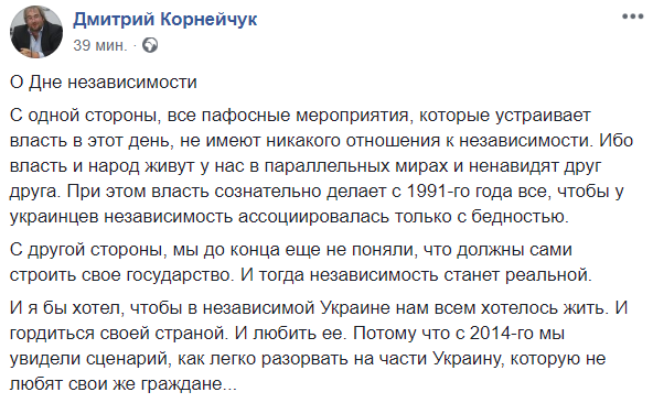 "С одной стороны, все пафосные мероприятия, которые устраивает власть в этот день, не имеют никакого отношения к независимости. Ибо власть и народ живут у нас в параллельных мирах и ненавидят друг друга. При этом власть сознательно делает с 1991-го года все, чтобы у украинцев независимость ассоциировалась только с бедностью.