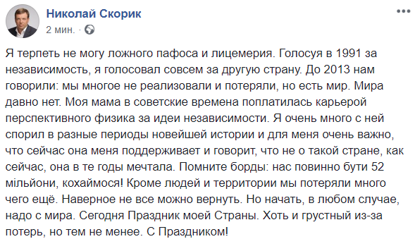 10:51 "Я терпеть не могу ложного пафоса и лицемерия. Голосуя в 1991 за независимость, я голосовал совсем за другую страну. До 2013 нам говорили: мы многое не реализовали и потеряли, но есть мир. Мира давно нет. Моя мама в советские времена поплатилась карьерой перспективного физика за идеи независимости. Я очень много с ней спорил в разные периоды новейшей истории и для меня очень важно, что сейчас она меня поддерживает и говорит, что не о такой стране, как сейчас, она в те годы мечтала. Помните борды: нас повинно бути 52 мільйони, кохаймося! Кроме людей и территории мы потеряли много чего ещё. Наверное не все можно вернуть. Но начать, в любом случае, надо с мира. Сегодня Праздник моей Страны. Хоть и грустный из-за потерь, но тем не менее. С Праздником!", - пишет в Facebook нардеп Николай Скорик.