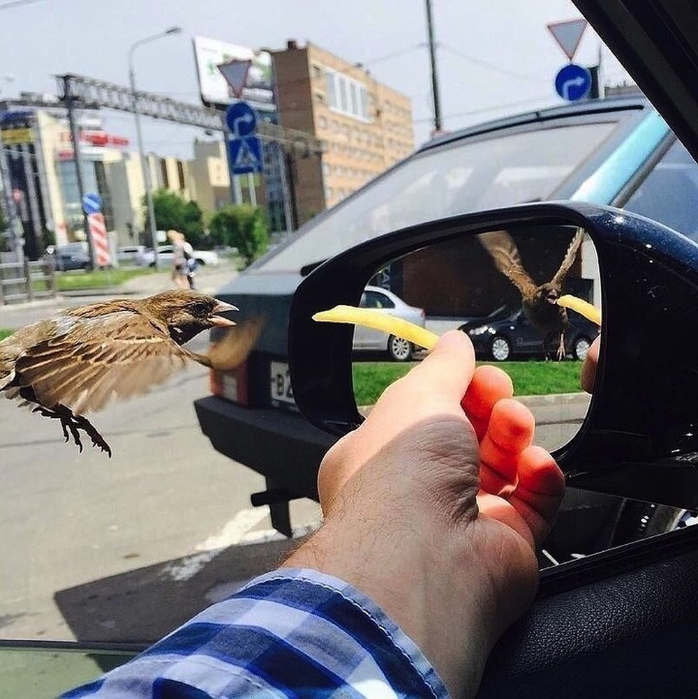 На сайте Код Дурова  пишут, что иодобное явление раньше вызывало недоумение и у пользователей Рунета, встретившихся с вирусной фотографией, на которой водитель кормит воробья вкусной, изящной, пикантной и ароматной картошкой фри. У птицы в отражении зеркала автомобиля крылья подняты вверх, при том, что перед зеркалом они вытянуты у неё горизонтально: